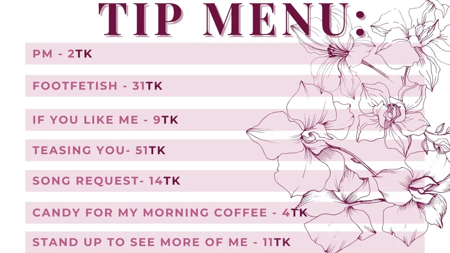 Erotisk dans, Twerk, Fotfetish, Kameltå, Hæler, Nylon, Upskirt, Skittensnakk, Doggy style, Stripping, Onani, Fingring, Orgasme, Puppeknull, Cuckold, Facesitting, Oljeshow, Blowjob, Spanking, Dildo eller vibrator, Cowgirl, Rollespill, Sexleketøy, Toppløs, Sprut
